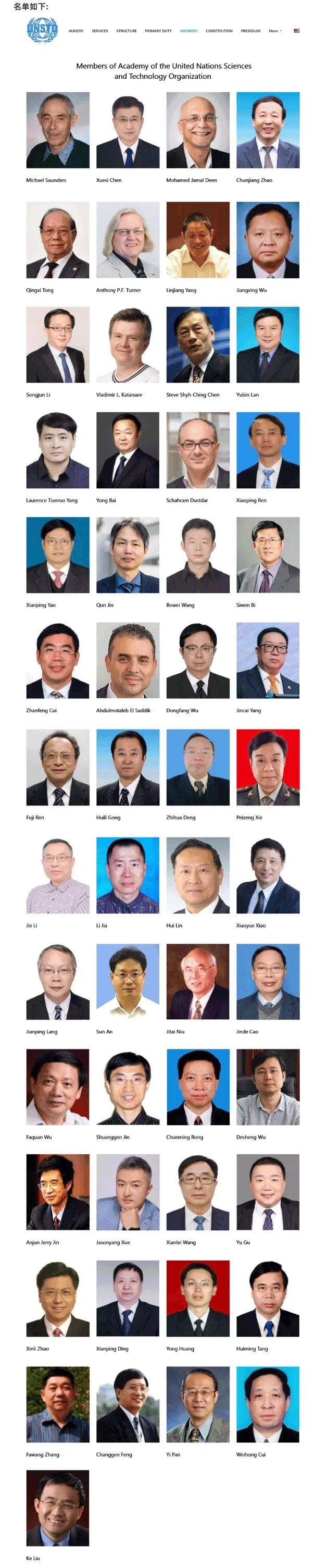 联合国科学院(Academy of the United Nations Sciences and Technology Organization,简称AUNSTO),隶属联合国科学技术组织(United Nations Sciences and Technology Organization),宗旨是团结国际科学技术专家,紧扣世界重大战略需求,探讨全球性行业重大革命性科技问题的国际性科学院。联合国科学院依据学科领域,分为生命与健康学部、人工智能与电子科技学部等20个学部。联合国科学院院士由具全球声誉的科学家及工程师构成,原则上为某个国家的科学院院士或工程院院士。联合国科学院新增院士的选举每年举行一次,每个学部每次增选不超5人。