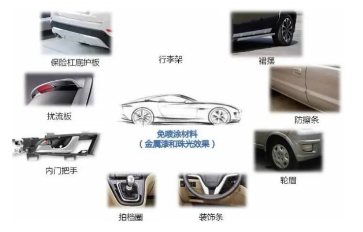 免喷涂材料应用范围广,在内、外饰件上均可有所应用。目前免喷涂塑料技术还不算很成熟,从环保角度看是一项很有前瞻性的技术领域。