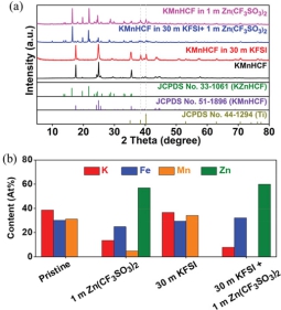 通过在不同电解液中进行Zn-K2MnFe(CN)6电池循环,团队证明K2MnFe(CN)6相变是锌离子插入诱导引起。如下图2所示,在不含锌离子的氛围中,仅进行K+脱嵌时正极材料的结构保持稳定,但在含有锌离子的电解质中材料发生结构变化,证明插入的Zn2+会引起结构变化形成KZnHCF。相应的充放电曲线也支持这一结论。
