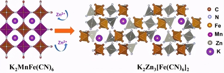 颗粒在线讯:水系锌离子电池具有容量高、成本低廉以及安全性好等优点,被视为最具前途的大规模电化学储能器件之一。在锌离子电池的各类可用正极材料中,普鲁士蓝材料因具备可调节的氧化还原电位和开放的3D结构,是最为理想正极材料之一。然而,不同于存储碱金属离子(如K+),该材料在存储Zn2+时并不能保持结构的稳定,因此循环过程中不仅容量偏低(<80 mAh/g),而且衰减较快,不能实现很长的循环寿命。对于这种快速衰减现象,“锌离子的插入引起结构畸变甚至生成新相,从而引起性能衰退”是得到较为广泛认可的一种解释;然而,这种新相的具体形成机制和过程尚未有过研究报道。此外,当搭配普鲁士蓝材料作为正极时,为了提高电池的稳定性,很多研究人员通过降低锌离子浓度,甚至采用无锌的电解液来降低锌离子的“毒化”作用,虽然取得了一定的效果,但不能从根本上解决问题。因此,研究并揭示普鲁士蓝类正极材料储锌的真实相变机制与电池衰减机理,具有十分重要的意义。