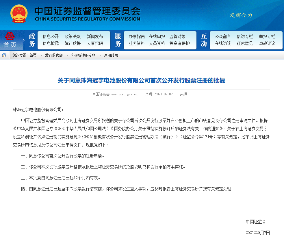 颗粒在线讯:9月7日,证监会发布消息,按法定程序同意珠海冠宇电池股份有限公司(以下简称“珠海冠宇”或“公司”)科创板首次公开发行股票的注册申请。