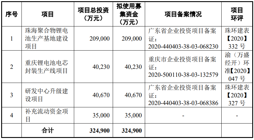 据招股说明书显示,珠海冠宇是一家主要从事消费类聚合物软包锂离子电池的研发、生产及销售,同时布局动力锂离子电池的企业。珠海冠宇将32.50亿元募集资金用于珠海聚合物锂电池生产基地建设项目、重庆锂电池电芯封装生产线项目、重庆锂电池电芯封装生产线项目以及补充流动资金项目。