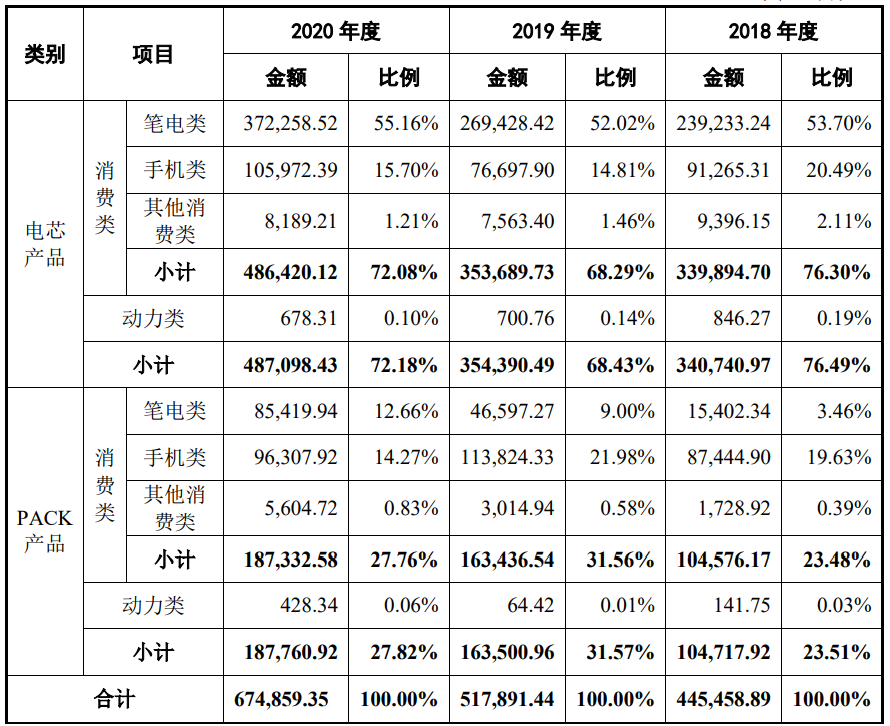 招股说明书显示,珠海冠宇的主要产品包括聚合物软包锂离子电池的电芯产品和PACK产品,具体如下: