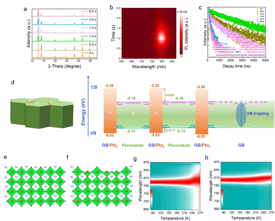 图3. a. 不同处理时间下的钙钛矿薄膜XRD图,PbI2峰为2θ=12.6°。b. c 不同处理时间下的钙钛矿薄膜的荧光发光和时间分辨荧光寿命结果,随着的PbI2的增多,荧光特性显示出先增强后减弱。d Type-I能带排列示意图,能有效地将电子和空穴排斥回晶粒内部,避免在晶界处被捕获。e.f表面终端由原来富FAI态变为富PbI2态。g.h 变温荧光光谱表征