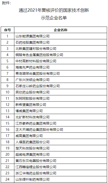颗粒在线讯:9月13日,工业和信息化部办公厅公布了2021年国家技术创新示范企业复核评价结果,山东能源集团有限公司等207家企业通过复核评价。