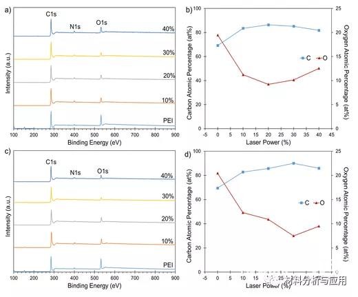 图4. (a) XPS 测量光谱和(b) 碳和氧的原子百分比作为 3D打印PEI上矩形图案LIG激光功率的函数。(c) XPS 测量光谱和 (d) 碳和氧的原子百分比作为商业 PEI 上LIG样品的激光功率的函数。
