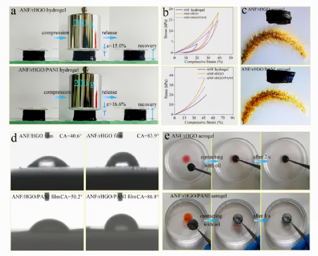 图1. (a) ANF/rHGO 和 ANF/rHGO/PANI 水凝胶的压缩过程。(b) ANF、ANF/rHGO 和 ANF/rHGO/PANI 水凝胶的压缩应力-应变曲线。(c) ANF/rHGO 和 ANF/rHGO/PANI 气凝胶样品,显示出轻质特性。(d) ANF/HGO、ANF/rHGO、ANF/HGO/PANI 和 ANF/rHGO/PANI 薄膜的静态水接触角。(e) ANF/rHGO 和 ANF/rHGO/PANI 气凝胶的油吸附过程。