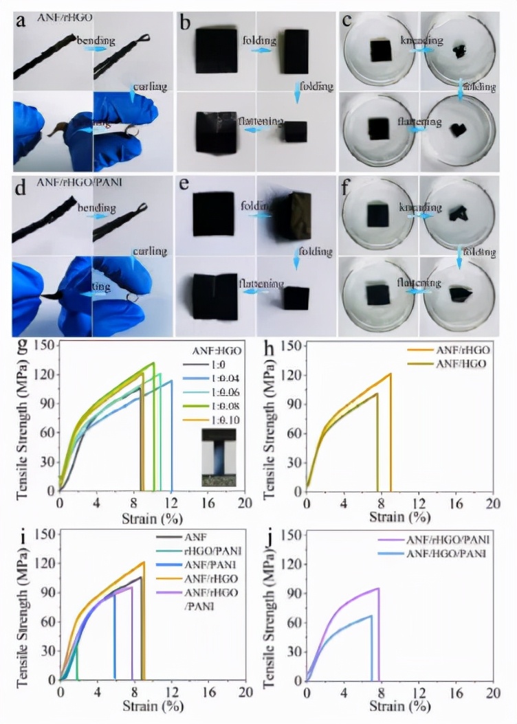 图2. 数码照片展示了 (a-c) 柔性 ANF/rHGO 和 (d-f) ANF/rHGO/PANI 薄膜的各种机械状态(初始、弯曲、折叠、卷曲和扭曲以及在水中揉捏和折叠)。 (g) 具有不同 ANF 与 HGO 质量比的 ANF/rHGO 薄膜的拉伸应力-应变曲线,(h) ANF/rHGO和ANF/HGO 薄膜的比较,(i)制备的柔性薄膜和(j)比较 ANF/rHGO/PANI 和 ANF/HGO/PANI 薄膜样品。