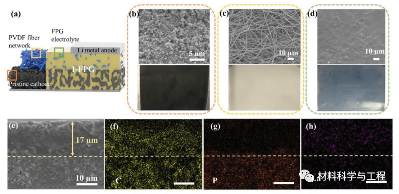 图2.a)全固态I-FPG电池示意图。扫描电镜图像(上图)和相应的表面形貌的数字图像:b)铸造阴极,c)在阴极上电纺的PVDF纤维网络,以及d)在阴极上制造的FPG电解质。E)I-FPG结构横截面的SEM图像。