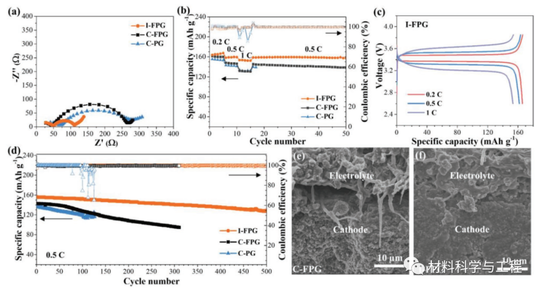 图5.45°C下全固态I-FPG、C-FPG和C-PG电池的电化学性能(A)奈奎斯特曲线,以及b)I-FPG、C-FPG和C-PG电池的倍率性能。C)I-FPG电池在不同速率下的电压分布。D)在0.5℃下循环的I-FPG、C-FPG和C-PG电池的循环性能e)C-FPG电池和f)I-FPG电池循环后阴极/固体电解质界面的横截面SEM图像