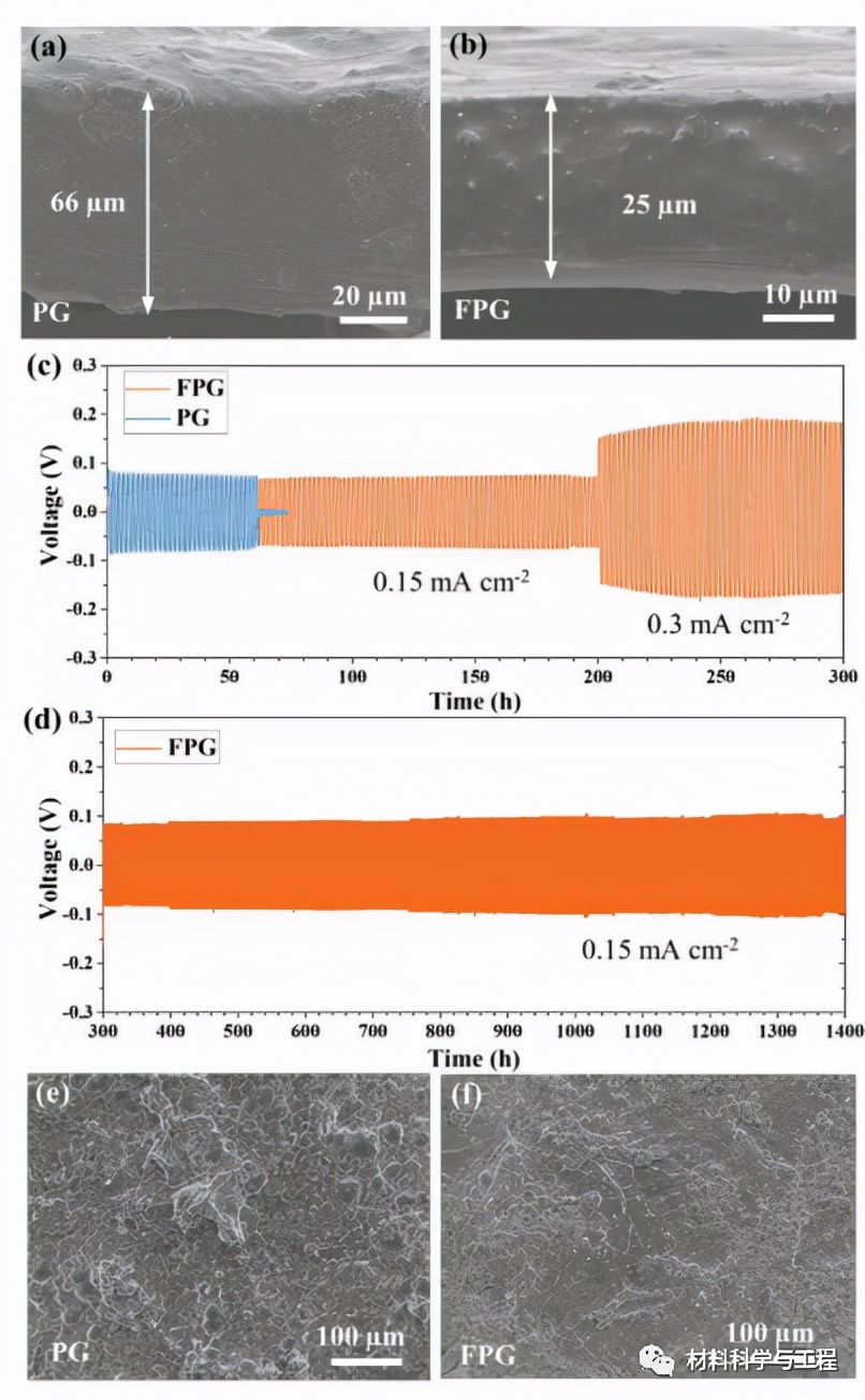 图4.独立的a)PG和b)FPG电解质的横截面扫描电镜图像。C)在45°C、0.15和0.3 mA cm−2下使用FPG和PG电解质的Li/Li对称电池的循环性能。d)使用FPG的Li/Li对称电池在0.15 mA cm−2下继续循环。2.100次循环后, e)PG电解液和f)FPG电解液的Li/Li对称电池的表面形貌的扫描电子显微镜图像.