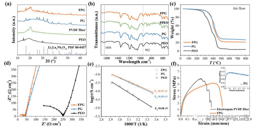 图3.a)XRD图谱,b)FT-IR曲线,c)TGA结果,d)室温下的EIS图,e)FPG、PG和PEO电解质的Arrhenius图。F)FPG电解质、PG电解质(插图)和电纺PVDF纤维网络的应力-应变曲线。