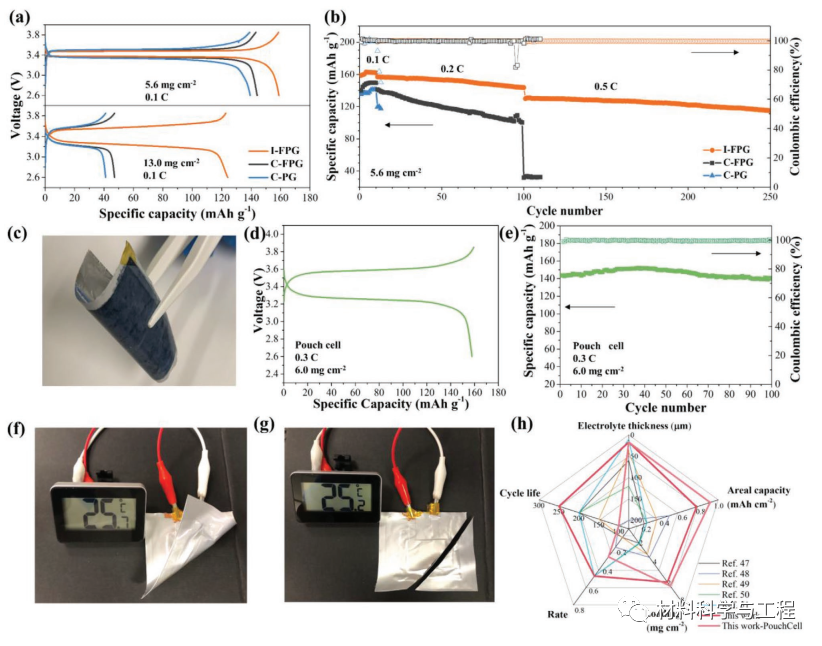 图6.高阴极负载下ASSLB的电化学性能。A)45°C下阴极负荷分别为5.6和13.0 mg cm-2的I-FPG、C-FPG和C-PG电池的电压范围。b)45°C下阴极负荷为5.6 mg cm-2的I-FPG、C-FPG和C-PG电池的循环性能。c)显示柔性I-FPG部分的数字图像。I-FPG袋电池的演示:d)电压分布和e)袋电池在0.3摄氏度、60°C下的循环性能;f)弯曲时为电子设备供电的袋电池照片;g)切割后的照片。H)使用开放文献中最近报道的基于PEO的电解液对ASSLB进行比较。