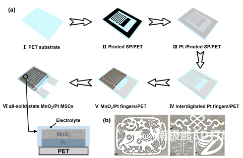 首先使用商用激光打印机以及商用打印耗材在PET膜上打印设计好的牺牲图案,然后通过磁控溅射构建金属层,在丙酮溶液中超声除去牺牲图案得到任意图案的金属层(图1b),再电化学沉积活性材料MnO2,最后涂覆凝胶电解质,得到MnO2基平面微型超级电容器(图1a)。