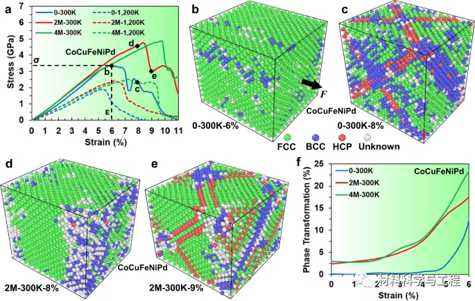 图2 CoCuFeNiPd HEA在在300 K(0,2和4 M样品)下,在300 K和1200 K的张力下,进行0,2×106和4×106次迭代后拉伸时的应力-应变曲线、原子构型和相变。