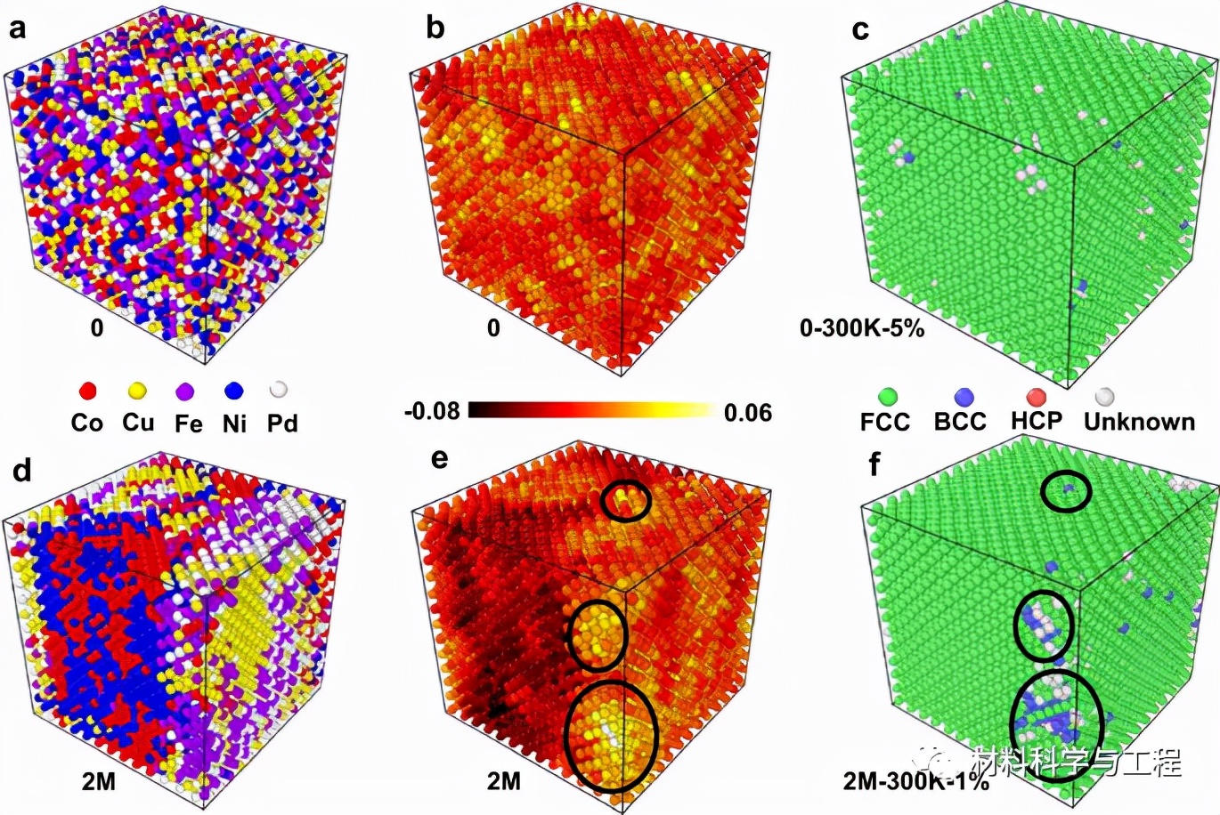 图3 在300 K时,CoCuFeNiPdHEA在0(0样品)和2×106 (2 M样品)迭代时的原子构型、相稳定性和局部结构。