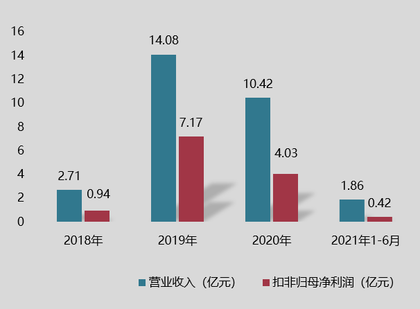 数据显示,2018年至2021年6月份期间,江苏灿勤科技营业收入分别为2.71亿元、14.08亿元、10.42亿元 、1.86亿元;扣非归母净利润分别为0.94亿元、7.17亿元、4.03亿元、0.42亿元。