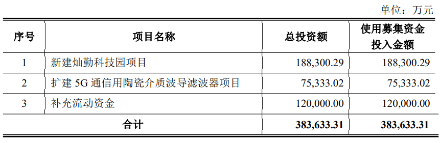 据招股说明书显示,江苏灿勤科技是一家主要从事微波介质陶瓷元器件的研发、生产和销售的企业。江苏灿勤科技拟将38.36亿元募集资金用于新建灿勤科技园项目、扩建5G通信用陶瓷介质波导滤波器项目以及补充流动资金。