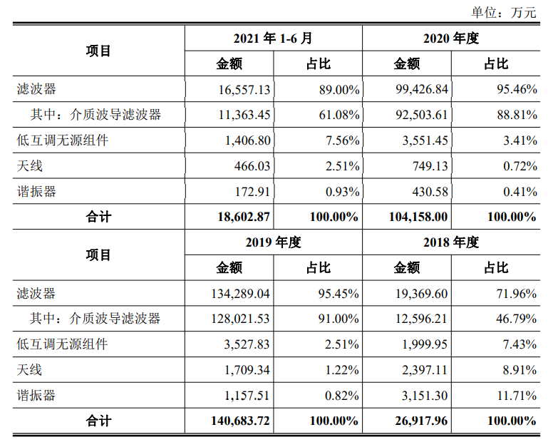 2021年1-6月份,江苏灿勤科技滤波器、谐振器、天线、低互调无源组件产品收入分别为1.66亿元、0.14亿元、0.05亿元、0.02亿元;占比分别为89.00%、7.56%、2.51%、0.93%。
