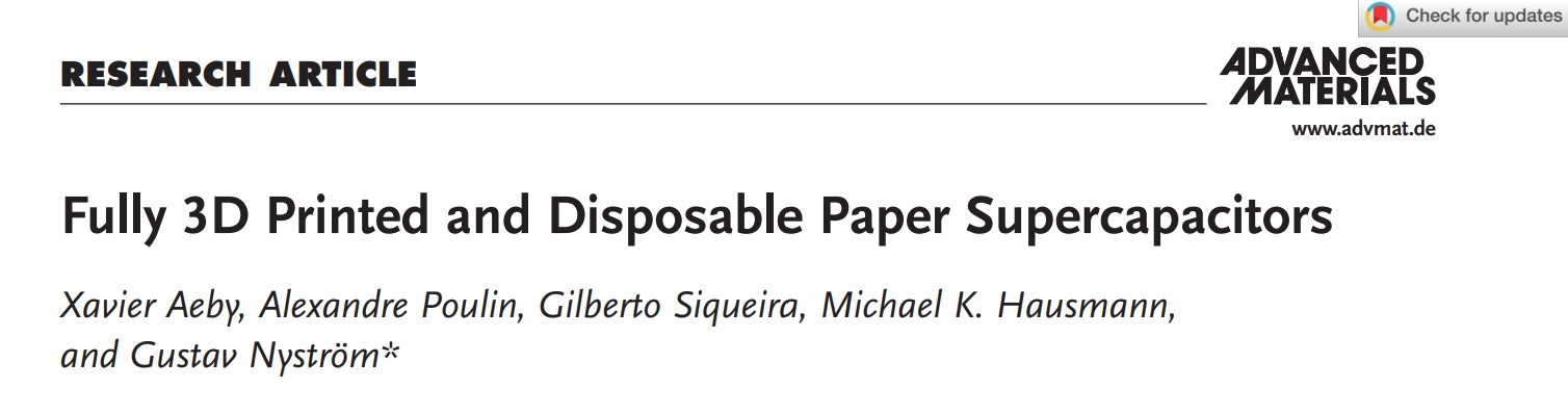 研究人员的发现详见他们的论文,题为 " Fully 3D Printedand Disposable Paper Supercapacitors",该论文由Xavier Aeby, Alexandre Poulin,Gilberto Siqueira, Michael K. Hausmann和Gustav Nyström共同撰写。