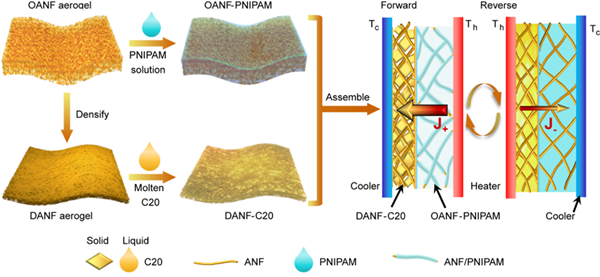 图1.气凝胶限域相变流体构筑柔性热二极管示意图