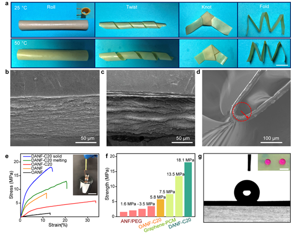 为了与OANF-PNIPAM相互匹配构建“Junction”结构,筛选出与PNIPAM相变温度接近、亲疏水性相反、热导率随温度变化趋势相反(即负温度系数)的C20作为相变流体,为了进一步提升薄膜柔韧性,选择DANF限域C20,最终获得C20熔融前后均具有良好柔韧性的DANF-C20薄膜(图3a)。DANF气凝胶薄膜与DANF-C20薄膜的微观形貌揭示了其具有优异柔韧性能的原因,即致密化消除了大孔(>50nm),初始3D多孔网络被压缩成分层结构,每一层均由芳纶纳米纤维密集编织而成(图3b-d),使DANF-C20抗拉强度较OANF-C20提高了3倍,且高于其他气凝胶相变材料。C20的疏水性也赋予了DANF-C20膜(图3g),使其与亲水的OANF-PNIPAM可直接接触形成稳定界面,避免因相互渗透,影响器件稳定性。