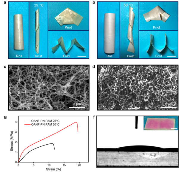 热导率随温度升高而升高(正温度系数)材料种类稀少,PNIPAM水溶液作为一种临界溶液温度(LCST,32°C)型相变流体可在温度升高时通过凝胶缩聚提升热导率,因而本研究利用OANF限域PNIPAM水溶液获得正温度系数气凝胶限域相变流体OANF-PNIPAM。得益于OANF自身柔韧性及PNIPAM流体特性,OANF-PNIPAM薄膜在环境温度低于或高于LCST时始终保持良好柔韧性,可反复卷曲、扭转、打结,甚至折叠(图2a-b)。对OANF、OANF-PNIPAM的扫描电镜照片可分析出,当温度超过LCST,PNIPAM分子由于发生相分离而包覆于芳纶纳米纤维上,提高了OANF-PNIPAM薄膜的机械性能(图2c-e)。此外,OANF-PNIPAM薄膜表现出亲水特性(图2f)。