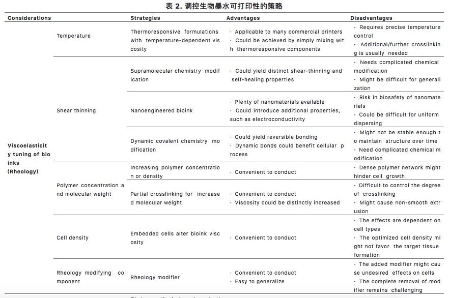 具有良好可打印性的生物墨水可以顺畅地通过打印喷嘴,形成具有高度形状保持能力的连续细丝,并能具有高度的结构完整性。评估生物墨水的可打印性主要方法包括定性描述、定量测量以及模拟仿真(图2)。影响生物墨水可打印性的因素是多方面的,包括材料特性(如粘度,剪切稀化,成胶速率,表面张力),以及打印条件(如挤出压强,打印速率,喷嘴尺寸,温度控制)。由于刺激响应生物材料在外界刺激条件下具有可控的物理化学变化,因而在调控生物墨水可打印性上有重要的作用。表2列举了通过刺激响应生物材料的特性调控生物墨水可打印性的一般策略。生物墨水在挤出之后应当被立即交联以保持结构的完整性和稳定性。由于刺激响应生物材料在剪切力,超声波,光照,温控,pH值,离子,等条件变化下能产生交联,因此在生物打印过程中调控刺激条件是调控生物墨水可打印性的重要一环(图3)。