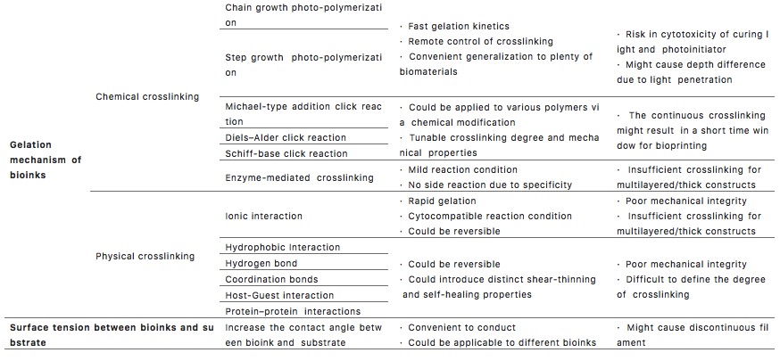 因为生物活性材料可以与细胞相互作用并引发特定的细胞反应(如增值,分化,迁移),所以生物墨水的生物活性对于细胞培养和生物打印组织结构的成熟至关重要。总体上,用于增强生物活性的策略包括:混合天然聚合物和生化因子(如生长因子、细胞因子和蛋白质),化学结合生物活性基序(如肽序列,生长因子)和脱细胞细胞外基质(dECM) 生物墨水的使用。