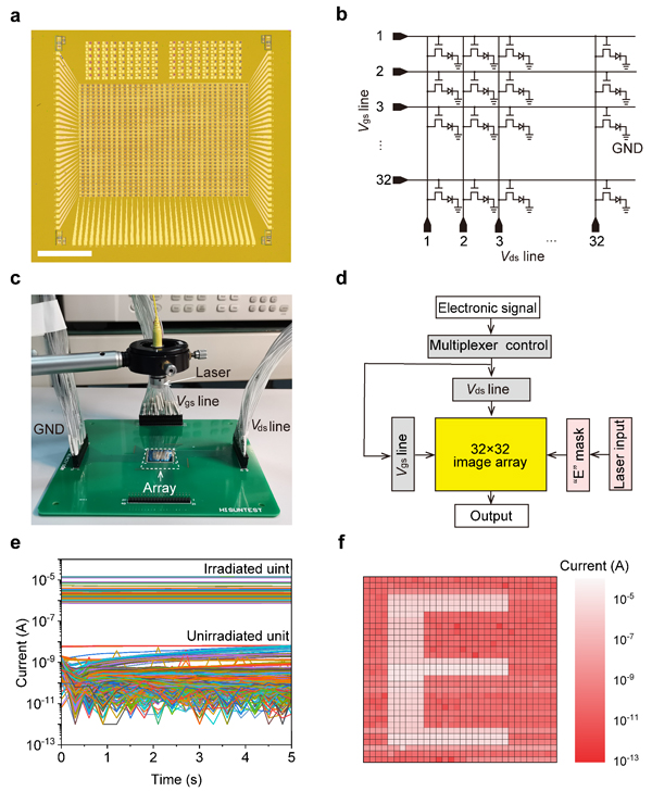 图4.光电探测器阵列。a、1024像素阵列的光镜图像(比例尺:3.25 mm),b、探测器阵列电路图,c、测试系统,d、基本架构,e、像素单元的光响应,f、探测器阵列的成像