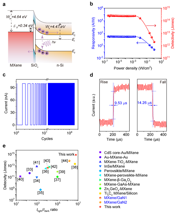图2.Ti3C2Tx/Si光电探测器的光电特性。a、光电探测器能带示意图,b、响应度、探测度随激光功率密度的变化,c、光开关响应,d、光电探测器响应时间,e、MXene光电探测器性能对比