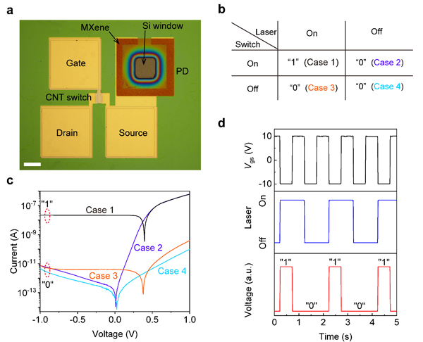图3.光电探测器阵列像素单元。a、像素单元的光镜照片(比例尺:50 μm),b、像素单元工作模式真值表,c、像素单元的伏安特性,d、像素单元对控制电压和光照的响应