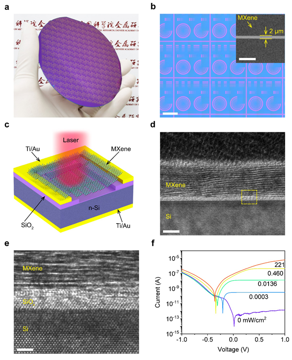 图1.Ti3C2Tx/Si 光电探测器。a、4英寸晶圆的图案化Ti3C2Tx薄膜,b、Ti3C2Tx薄膜的光镜图像(比例尺:2.5 mm),插图:薄膜的SEM图像(比例尺:10 μm),c、光电探测器结构示意图,d、光电探测器横截面TEM图像(比例尺:10 nm),e、放大的界面TEM图像(比例尺:4 nm),f、光电探测器的光响应特性