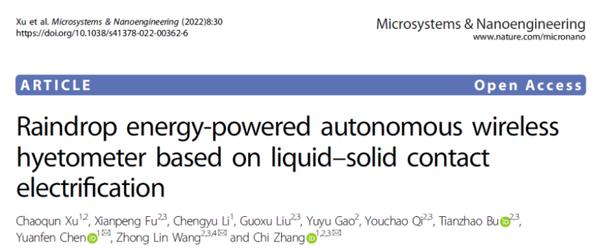 Xu, C., Fu, X., Li, C. et al. Raindrop energy-powered autonomous wireless hyetometer based on liquid–solid contact electrification. Microsyst Nanoeng 8, 30 (2022).