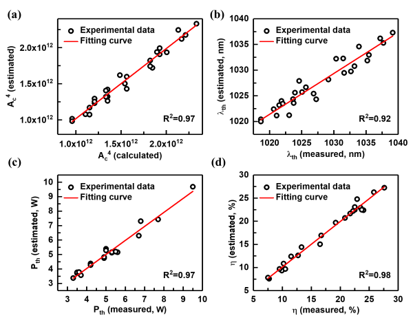掺镱磷酸盐光纤激光性能的计算值和预测值比较图:(a)光纤损耗效应修正系数;(b)激光阈值附近的输出波长;(c)激光阈值;(d)激光斜率效率