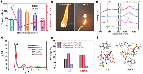 图1.局部高浓度离子液体基电解液物理化学性质及锂离子溶剂化结构分析