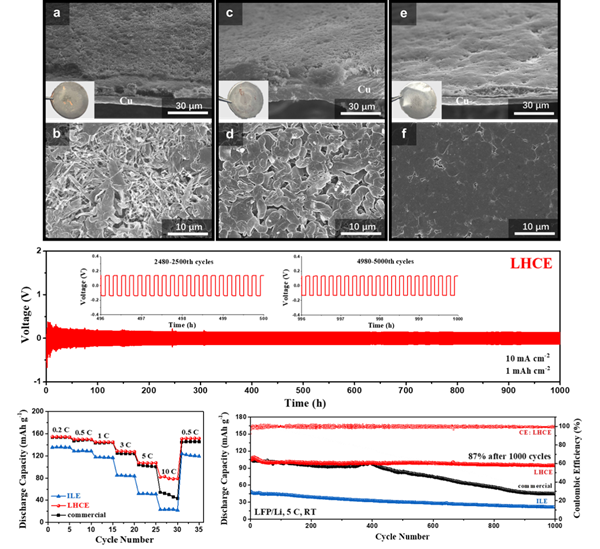 为解决上述问题,中国科学院苏州纳米技术与纳米仿生研究所吴晓东团队设计出一种基于不燃的离子液体和低粘度的氢氟醚稀释剂的局部高浓度电解液,可以改善离子液体本身存在的粘度高、隔膜浸润性差、离子电导率低、成本高的缺点;并可以保证电解液本身的阻燃性和高的电化学窗口,提高电池的安全性能。该工作通过研究和调控锂离子溶剂化结构,使得锂离子溶剂化层中主要由FSI-阴离子构成,有利于促进阴离子在锂金属负极表面优先分解形成稳定的无机SEI层,从而获得均匀致密的锂沉积形貌。采用该类电解液的锂金属电池表现出优异的倍率和长循环性能。