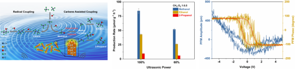 利用压电力显微技术表征了BiOCl、C3N4等材料的压电响应,并通过相关金属离子氧化还原反应证实了这些材料的压电催化活性位点。在空气气氛下,超声BiOCl或C3N4的纯水悬浮液可以分别得到28μmol/h和34μmol/h的H2O2产率,高于相应的光催化过程所得H2O2产率,表明这些材料在压电场下对氧气分子具有更强的催化效应,压电催化反应的效率具有进一步应用发展的潜力。相关研究成果分别发表于ChemSusChem 11 (2018) 527‐531和Journal of Materials Chemistry A 6 (2018) 8366‐8373。