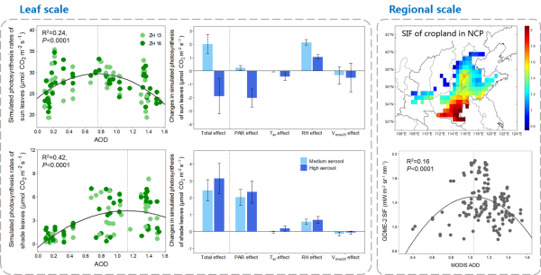 图1.大气气溶胶对农作物光合在叶片和区域尺度上的影响