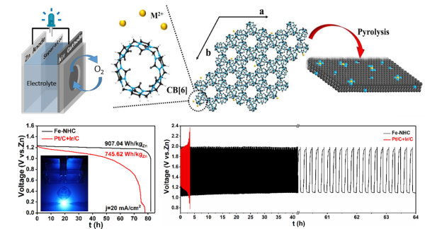 中国科学院福建物质结构研究所研究员曹荣和曹敏纳研究团队设计并合成了一系列单原子催化剂(M-NHC,M=Fe, Co, Ni),其中Fe-NHC在锌空电池的性能测试中表现出比市售催化剂更高的功率密度、能量密度和稳定性。该催化剂是以大环化物六元瓜环(CB[6])自组装得到的棒状超分子为碳前驱体,与廉价的金属盐混合均匀后通过简单的热解法合成得到。在合成过程中借助于瓜环超分子自组装体内部固有的孔道结构,无需添加模板剂或者繁杂的后处理过程即可制备出具有分级微介孔结构的多孔N掺杂碳载体,实现有效锚定金属单原子的同时具有更高效的传质及电子转移功能。在组装成锌空电池时,Fe-NHC能够达到157mW/cm2的功率密度,远高于市售催化剂Pt/C和Ir/C混合催化剂的120mW/cm2。在10mA/cm2的放电测试过程中,Fe-NHC能够维持长达60小时,而市售贵金属催化剂在4个小时后出现严重的电压损失。该工作通过简易方法合成了廉价且高效稳定的锌空电池空气极电催化剂,也为无模板法合成单原子催化剂提供了新策略。
