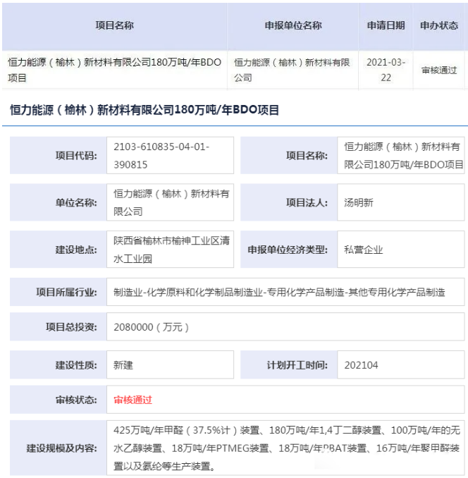 近日,陕西政务服务网公开信息显示,恒力能源(榆林)新材料有限公司180万吨/年BDO项目项目备案已审核通过。