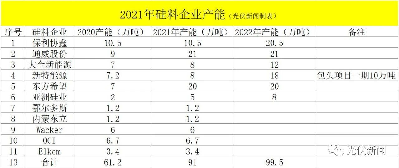 1、通威股份:通威股份有乐山、包头、保山三大硅料生产基地,目前9万吨产能,包头通威二期4万吨,保山通威产能4万吨,四川通威二期4万吨产能目前建设中,2021年产能将达到21万吨左右。