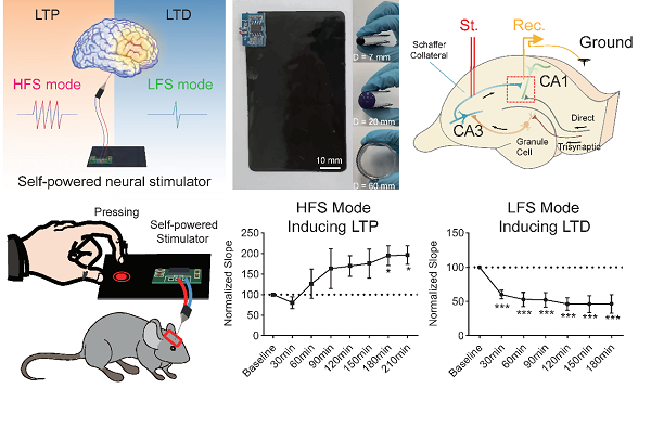 自驱动柔性可穿戴神经刺激器在清醒动物模型中进行了验证。研究人员将该设备接入小鼠大脑,信号调制模块将搜集的能量调制成双模刺激信号,在无需外界供能的情况下,成功诱导出海马体长时程增强和长时程抑制的形成。这项工作克服了传统商业电刺激器设备体积庞大以及配套电源带来潜在隐患等缺点,为基于突触可塑性的神经系统疾病治疗以及双向脑机交互提供新思路。