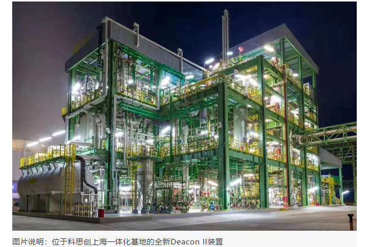 科思创上海一体化基地Deacon II项目(盐酸氧化装置)近日正式运行,将进一 步降低生产能耗与成本,提升生产效率,为科思创推动可持续发展和循环经济的 战略目标作出贡献。
