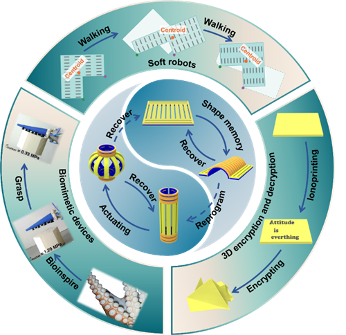 得益于可编程、程序化的变形能力,智能变形凝胶不再局限于智能抓手、阀门系统以及人工肌肉等传统的应用领域,而可进一步被应用于软体机器人、仿生系统以及信息存储与加密等领域。例如,基于可程序化的变形,智能变形凝胶可以将自身变形行为转变成运动行为,从而制备具有运动功能的软体机器人;基于水凝胶良好的生物相容性以及软、湿特性,智能变形凝胶可通过变形转变自身表面结构从而制备仿生章鱼抓手等一系列仿生系统;最后,基于水凝胶良好的分子可设计性,智能变形凝胶还可与荧光凝胶相结合,通过变形与荧光功能的协同在水凝胶体系中实现信息的多重加密与解密。