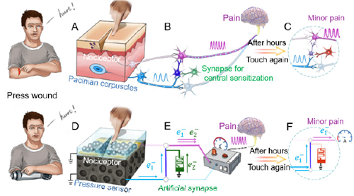 图2 (A-C)人体的痛觉感知系统的工作机理示意图,(D-F)仿生痛觉传感系统的工作机理示意图
