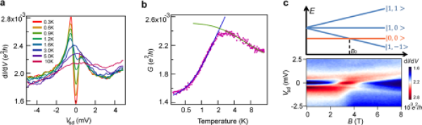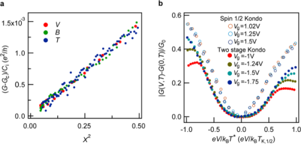 图4 a.二阶近藤效应低能量状态下微分电导随电压(V)磁场(B)温度(T)表现出普适的平方关系;b.二阶近藤效应与自旋1/2近藤效应中非平衡输运的差异