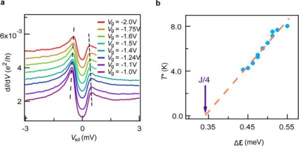 图3 a.二阶近藤共振微分电导随栅压的变化;b.二阶近藤效应中近藤温度T*与器件分子中自旋单态/三态的能量差Δε的关系