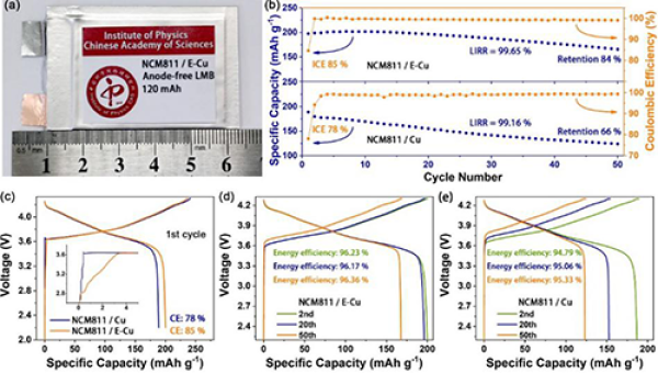 图6.无负极NCM811/ E-Cu软包电池的展示。(a)120mAh总容量多层无负极软包电池的数码照片。(b)NCM811/ E-Cu(up)和NCM811/ Cu(down)软包电池的循环性能。(c)NCM811/ E-Cu和NCM811/ Cu软包电池的电压曲线。(d)NCM811/ E-Cu和(e)NCM811/ Cu软包电池不同循环圈数下的电压曲线。
