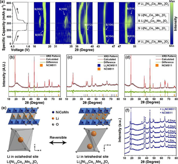 图4.NCM811和Li2NCM811之间可逆相变的评估。(a)NCM811半电池的充放电曲线和对应的XRD图样等高线图。NCM811(b)放电到2.6V,(c)放电到1.6V,(d)充电回到3.6V时的XRD图样及对应的精修数据。(e)NCM811和Li2NCM811的晶体结构以及相应的Li占位。(f)锂化后NCM811正极在湿度为15%的空气中的化学稳定性。